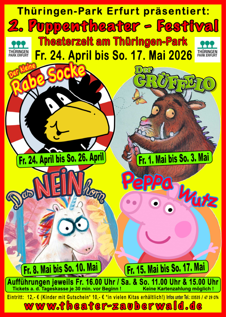 der Familie Sperlich ist seit vielen Jahren in ganz Deutschland unterwegs und begeistert das Publikum. Tolle Geschichten mit farbenfrohen Bühnenbildern und detailverliebten Handpuppen, wie zum Beispiel „Das NEINhorn“ von Marc-Uwe Kling & Astrid Henn oder „Der kleine Rabe Socke“ von Nele Most & Annett Rudolph erwarten Euch bei einem Besuch im Figurentheater Zauberwald.